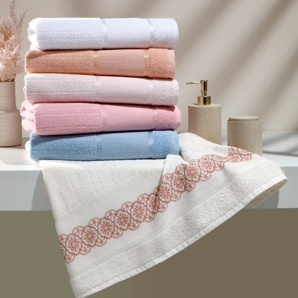 Disponível em uma paleta cuidadosamente selecionada, esta toalha permite personalização de acordo com o seu estilo ou da decoração do ambiente. As opções de cores incluem Vermelho, Pérola, Rosinha, Jeans, Batom, Bege Médio, Azul Claro, Cinza Claro e Rosa Chiclete, todas apresentando tonalidades suaves e elegantes que valorizam o bordado.