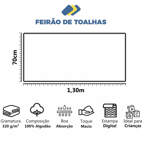 Confeccionada em 100% algodão, possui toque macio e aveludado, garantindo uma sensação agradável na pele. Sua estampa digital traz cores vivas e divertidas, e o tecido leve e compacto facilita o transporte. Além disso, não gruda areia e oferece excelente absorção, tornando o pós-mergeulho mais confortável e higiênico para os pequenos.